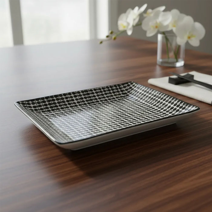 Descubre la elegancia y funcionalidad de este plato de porcelana. Con un diseño rectangular y un acabado en blanco y negro, este plato es ideal para realzar cualquier presentación en la mesa, ya sea en ocasiones especiales o en el día a día. Su material de alta calidad garantiza durabilidad y resistencia, convirtiéndolo en una opción perfecta para el menaje de cocina. Su diseño atemporal se adapta a cualquier estilo de decoración, aportando un toque de sofisticación a tu mesa.